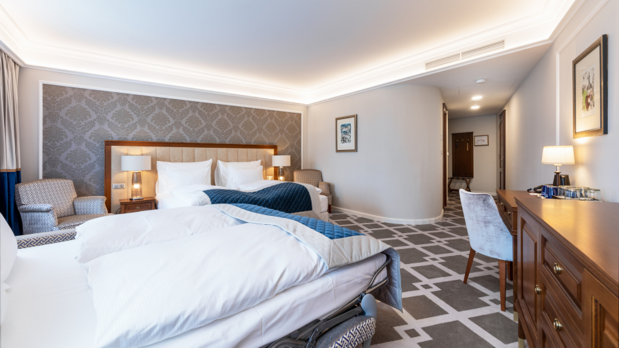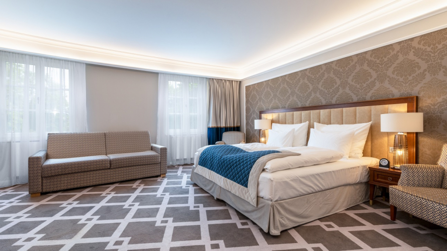 Luxus priestoru a pohľady z okna do zámockého parku sú výhodami tejto priestrannej izby s rozlohou od 36 m2. Scenérie mohutných stromov, úzke chodníky s pomníkmi panských psov Jána Pállfyho i trblietavá hladina jazera, to je krásno v každom ročnom období. Výnimočné vankúše a paplóny s antialergickou úpravou husacieho páperia a peria v posteliach s luxusnými matracmi vám umožnia príjemný spánok. Priestranná kúpeľňa s veľkorysou sprchou poskytuje dostatok pohodlia na relax.