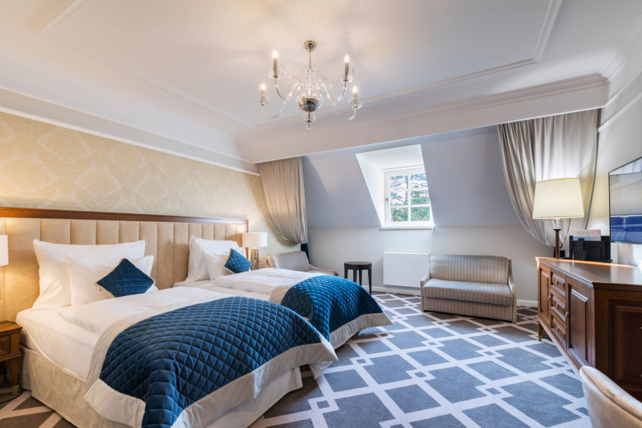 Luxus priestoru a pohľady z okna do zámockého parku sú výhodami tejto priestrannej izby s rozlohou od 32 do 35 m2. Scenérie mohutných stromov, úzke chodníky s pomníkmi panských psov Jána Pállfyho i trblietavá hladina jazera, to je krásno v každom ročnom období. Výnimočné vankúše a paplóny s antialergickou úpravou husacieho páperia a peria v posteliach s luxusnými matracmi vám umožnia príjemný spánok. Priestranná kúpeľňa s veľkorysou sprchou poskytuje dostatok pohodlia na relax.