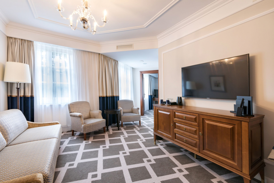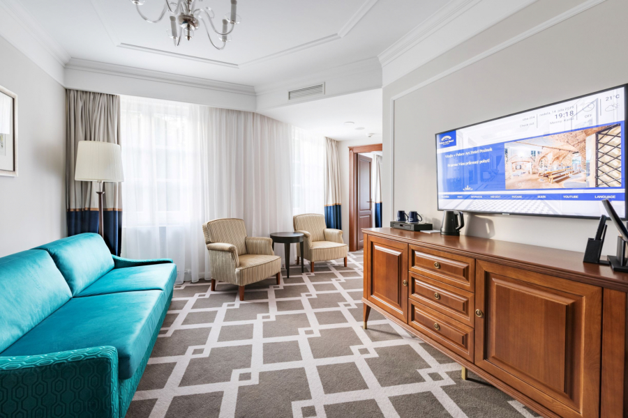 Elegantné súkromie s rozlohou 55m2 s luxusnou obývačkou a spálňou to je príjemné bývanie na zámku. Výhľad vám dodá energiu prírody v každom čase. Vankúše a paplóny s antialergickou úpravou husacieho páperia a peria a luxusné postele a matrace zaručia príjemný a výdatný spánok. Priestranná kúpeľňa s veľkou sprchou poskytuje dostatok pohodlia na relax.